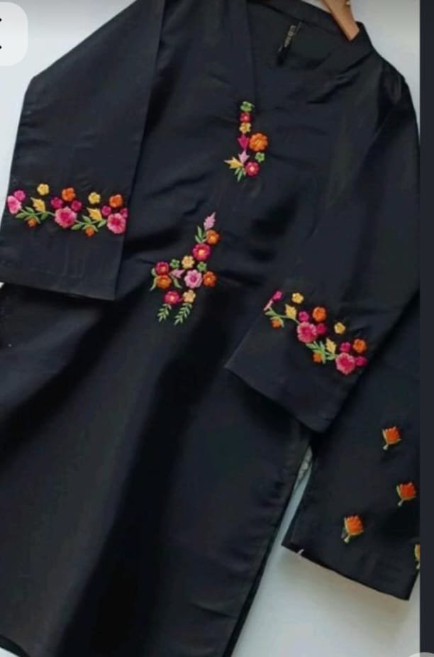 Floral shades of pink, orange, yellow, and green leaves, creating a lively contrast against the black background Sleeves Decorated with Horizontal floral bunches near the cuffs Small single flowers and buds scattered closer to the elbows.