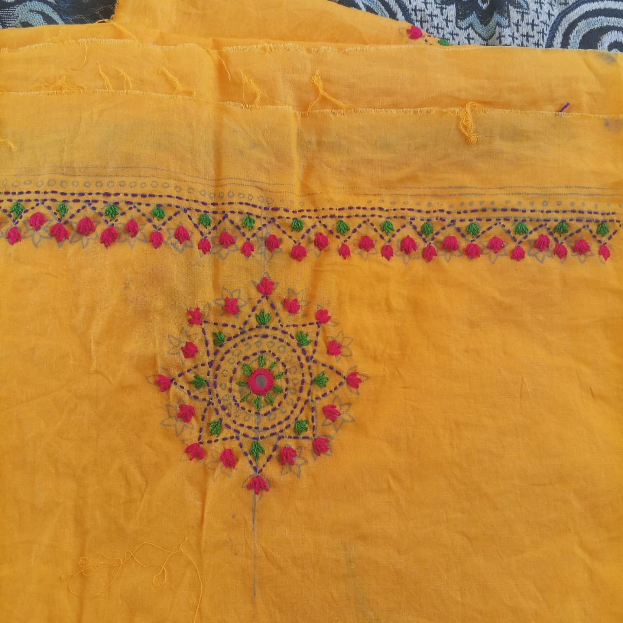Light lawn , Mustard yellow base. Embroidery Style is in Geometric and floral fusion. Neckline is in rounded with a U-cut and short placket-style slit