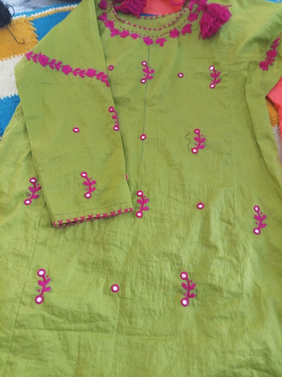 Complete Embroidery and mirror work on Neckline And sleeves,