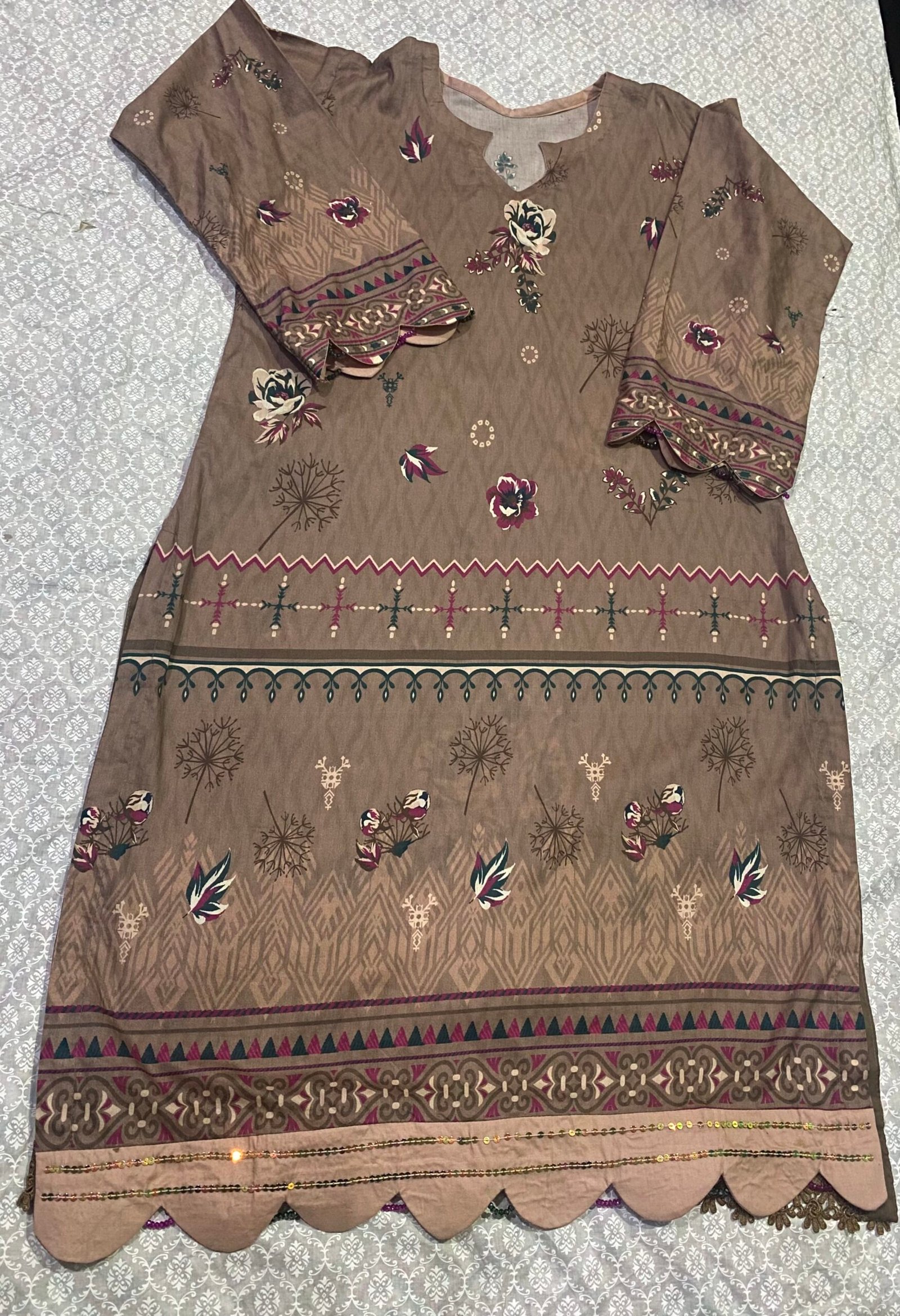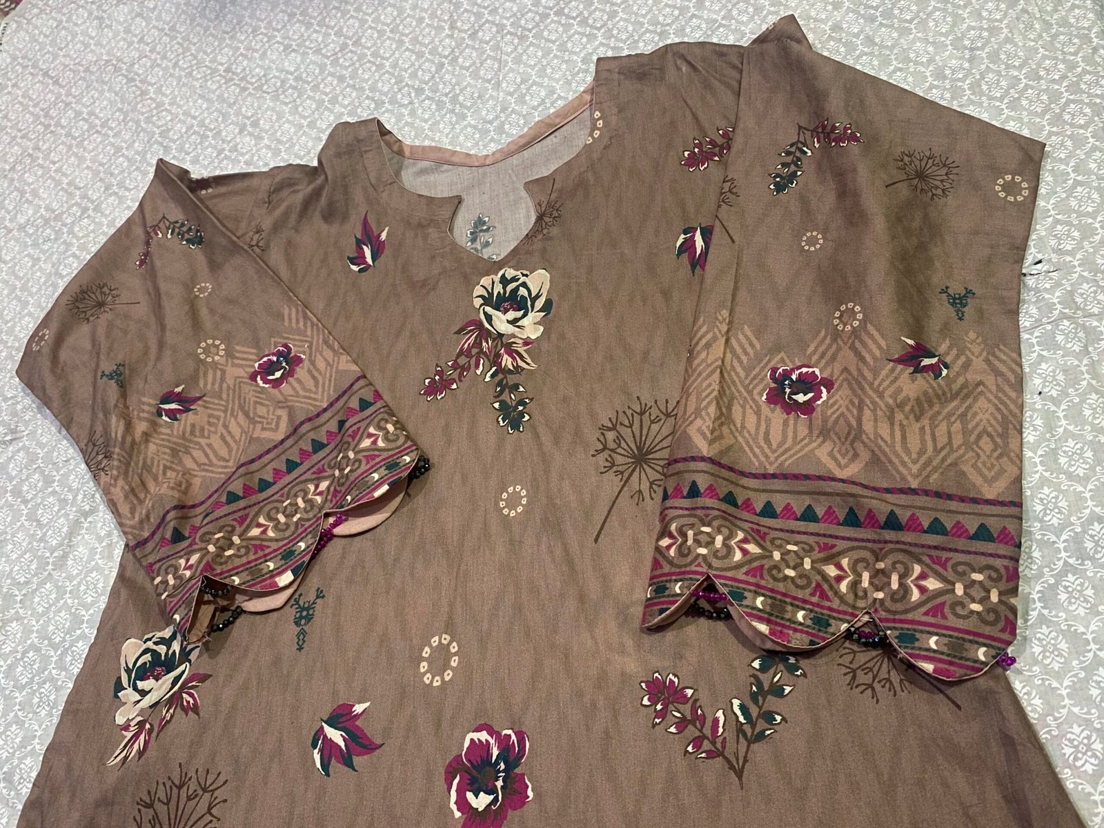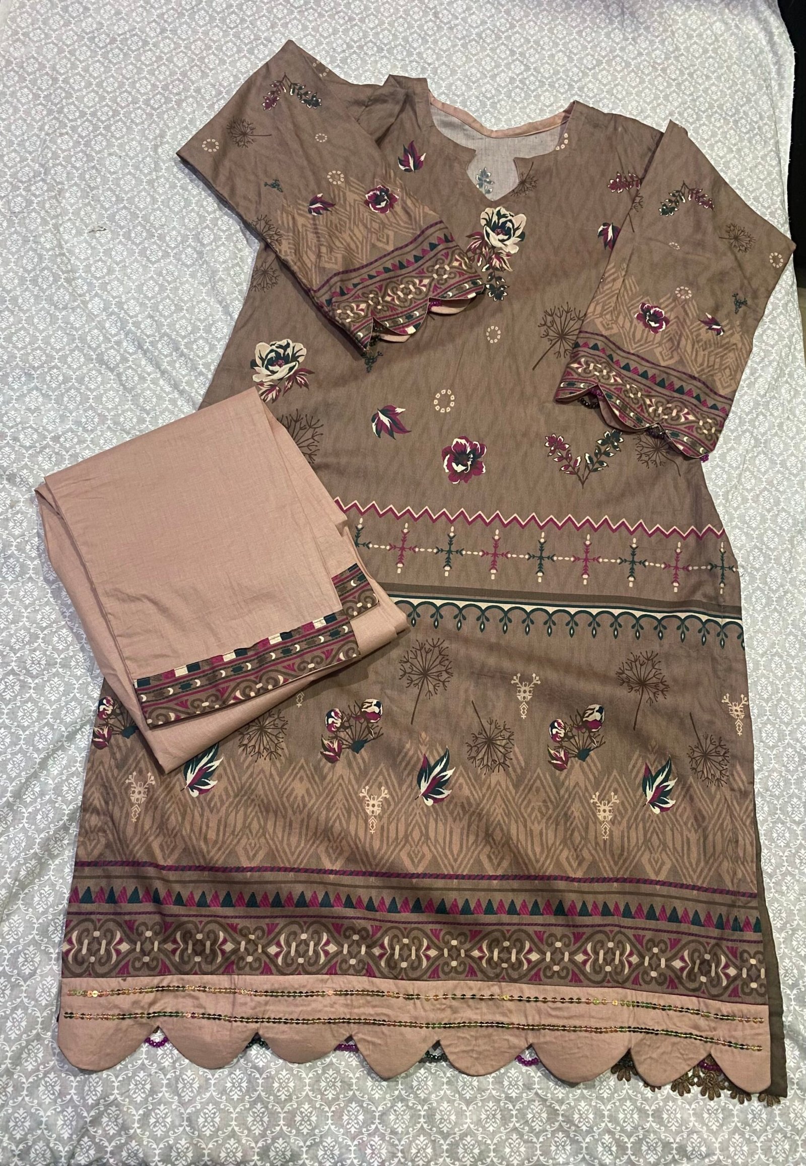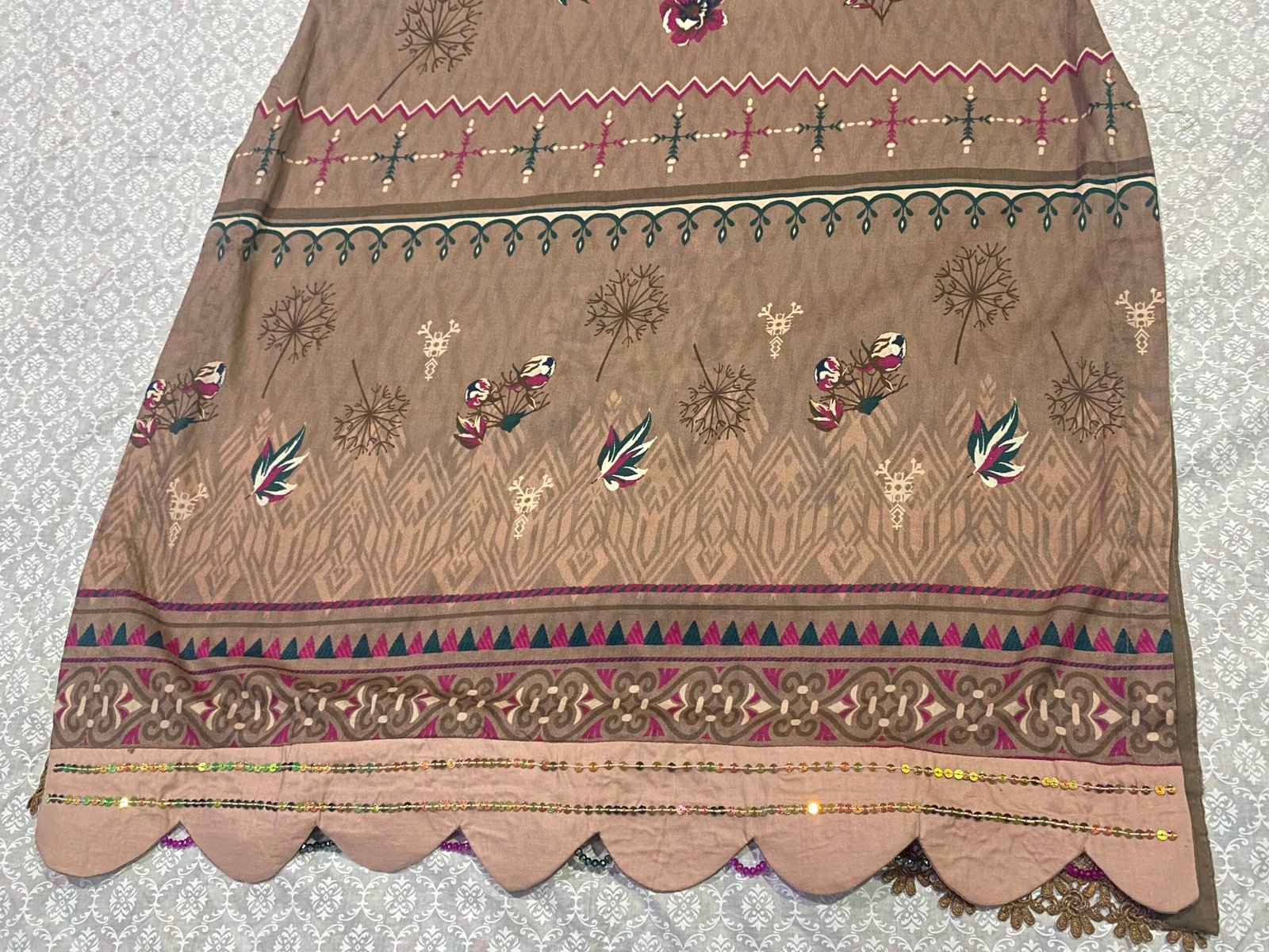 This is a light brown and pink two-piece branded dress with delicate floral embroidery in multiple colors across the front. The sleeves feature matching embroidery with intricate borders at the cuffs and the lace is imprinted at the bottom of the back side. The bottom edge of the dress has stitched designs with a wavy shape It is paired with a plain light pink bottom, giving it an elegant and graceful look.